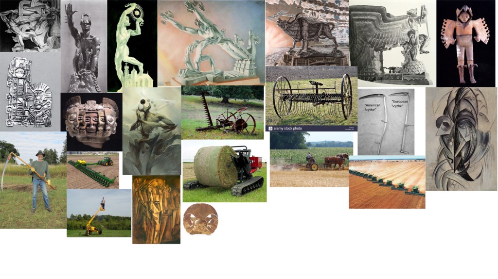 Throughout this project, I’ve been referencing farming equipment, artists with a particular way of depicting humanoid forms, sculptures from a Polish artist I found, called Stanislaw Szukalski. The humans and animals he portrays have a very industrial feel to them that I like. I was looking at different farming tools, as well as ancient South American art.