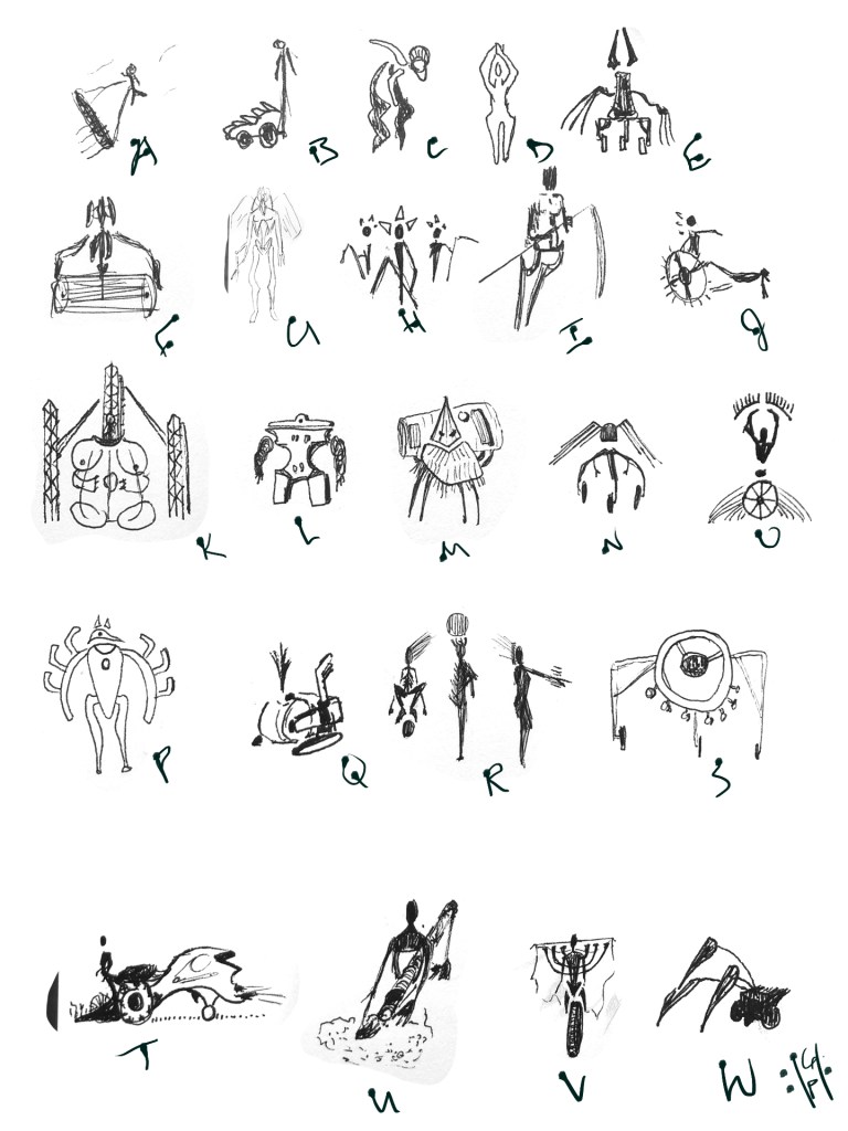 My first creature will be a part of a larger passion project I was making in conjunction with my younger brother. It takes place on a fictional and lush planet that starts of in balance, but external forces cause the corruption of the original occupants. So the creature I am designing is a robot-type creature. At one point, this creature was created to maintain the fields for a farming society. They stood to ward of animals, plow the fields, help harvest crops. I have not chosen the specific function of my creature yet, but these were all going through my head as I was creating silhouettes. I am fond with most of the designs, but I plan to run them by my peers before class to see which ones maybe have the most visual appeal. There are a couple that would come in small groups, so I might have to design more than one for a single project (see design H and R). Here are the initial designs as they are: