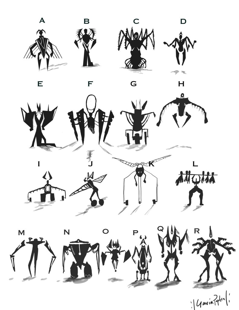 This week I finished out the silhouettes for my first creature design. This was actually really fun for me to do, and I didn’t spend more than five minutes on any given design. I think that I have a lot to work with with these thumbnails.